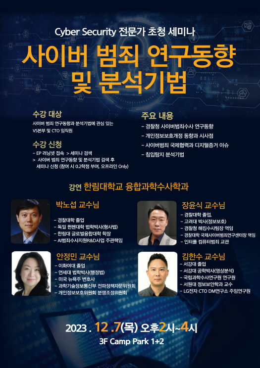 사이버 범죄 연구동향 및 분석기법 특강을 진행합니다.