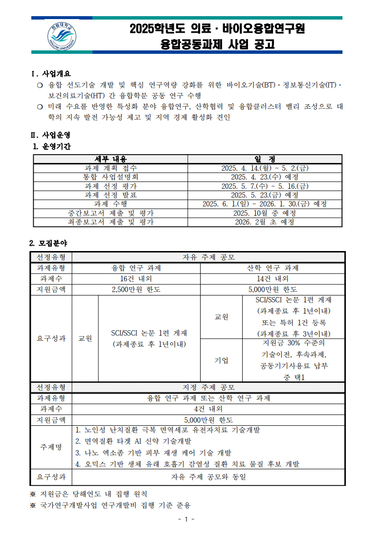 * 2025 의료·바이오융합연구원 융합공동과제 공모안내 *
