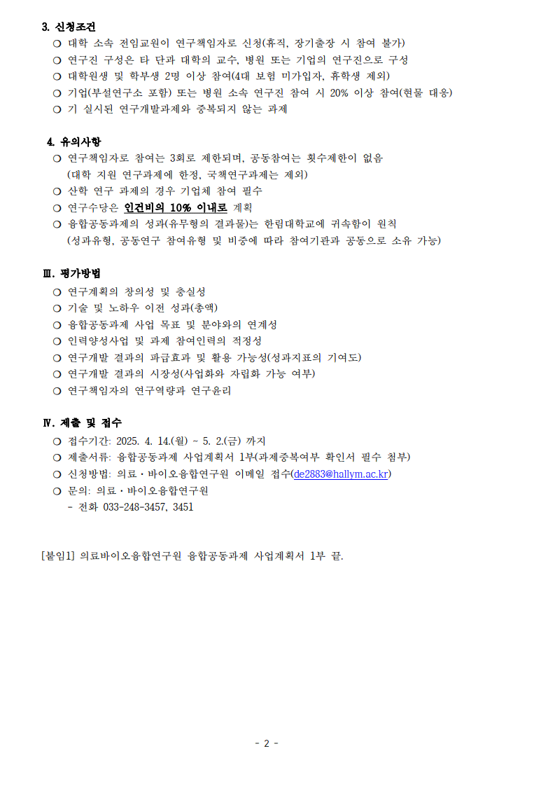 2. 신청방법: 의료·바이오융합연구원 이메일 접수(de2883@hallym.ac.kr)