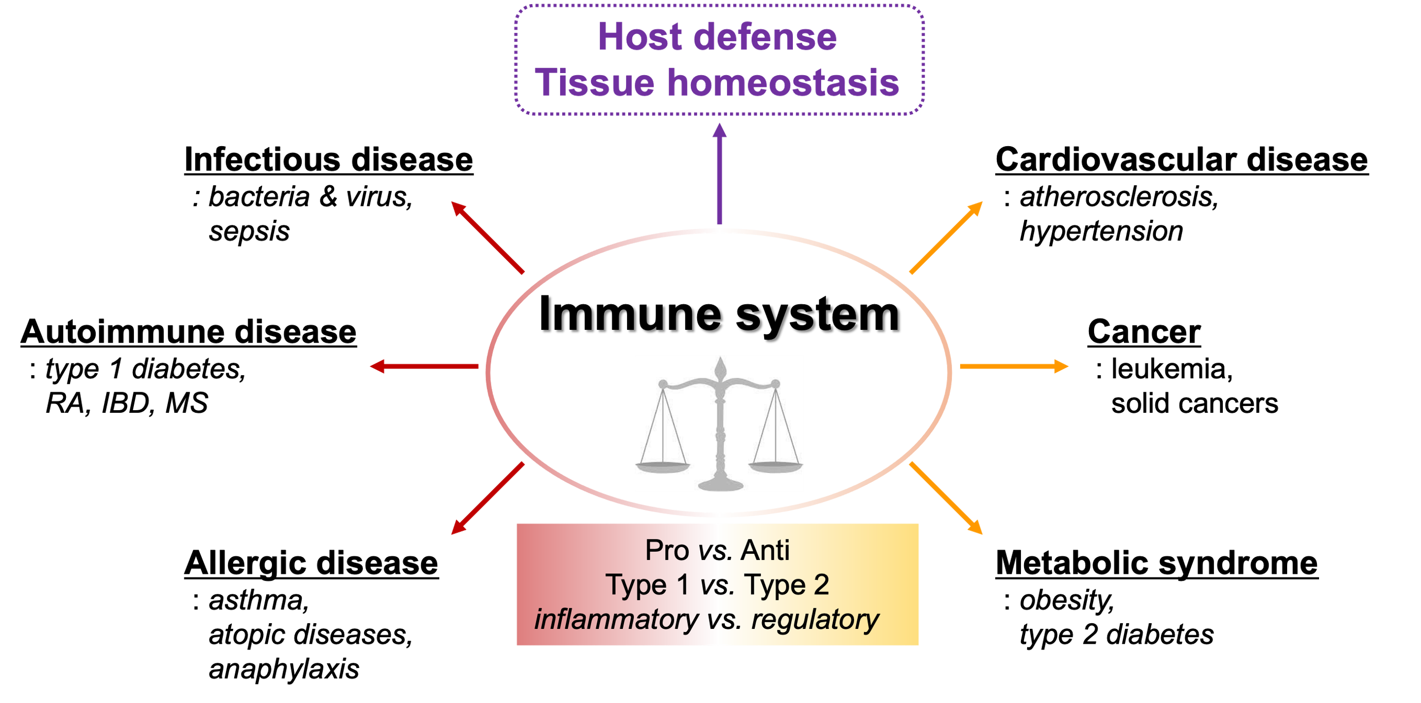 인체의 면역시스템은 병원균 감염에 대한 방어, 조직 항상성 유지 및 암 발생 억제 등의 기능을 수행한다. 하지만 다양한 원인으로 인한 면역시스템은 이상은 병원균에 대한 인체 방어 기능의 무력화를 야기할 수 있고, 비정상적 염증반응으로 인한 당뇨병, 관절염 등 자가면역질환 뿐만 아니라 암의 성장을 촉진할 수 있습니다. 최근 암, 대사질환 등 비면역성 난치성 질환의 발병 및 병리진행 과정에서 염증 반응의 중요성이 부각되고 있고, 이에 발맞춰 면역활성 제어에 기반한 난치성 질환 치료 기술이 활발히 개발되고 있습니다. 대표적인 예로서 면역관문치료제 (Immune checkpoint blockade)는 항암 면역반응의 재활성화에 기반한 차세대 항암치료요법으로 자리 잡고 있습니다.암생물학 실험실은 대식세포, T 세포, B 세포 등 면역 세포의 기능적 분화를 조절하는 신호전달 메커니즘 연구를 바탕으로 in vitro 공배양 플랫폼 및 동물실험 등을 통해 i) 미생물-점막조직 숙주세포 상호작용과 ii) 암세포-암미세환경 기질세포 상호작용을 매개하는 면역세포의 기능을 규명하는 연구를 수행하고 있습니다. 또한, 조직내 세포간 상호작용에 따른 면역세포 분화를 제어하는 핵심 신호전달인자 발굴을 통해 궤양성 대장염, 암 등의 난치성 질환 치료 및 신규 백신보조제 개발을 위한 분자적 타겟을 발굴하고자 합니다.